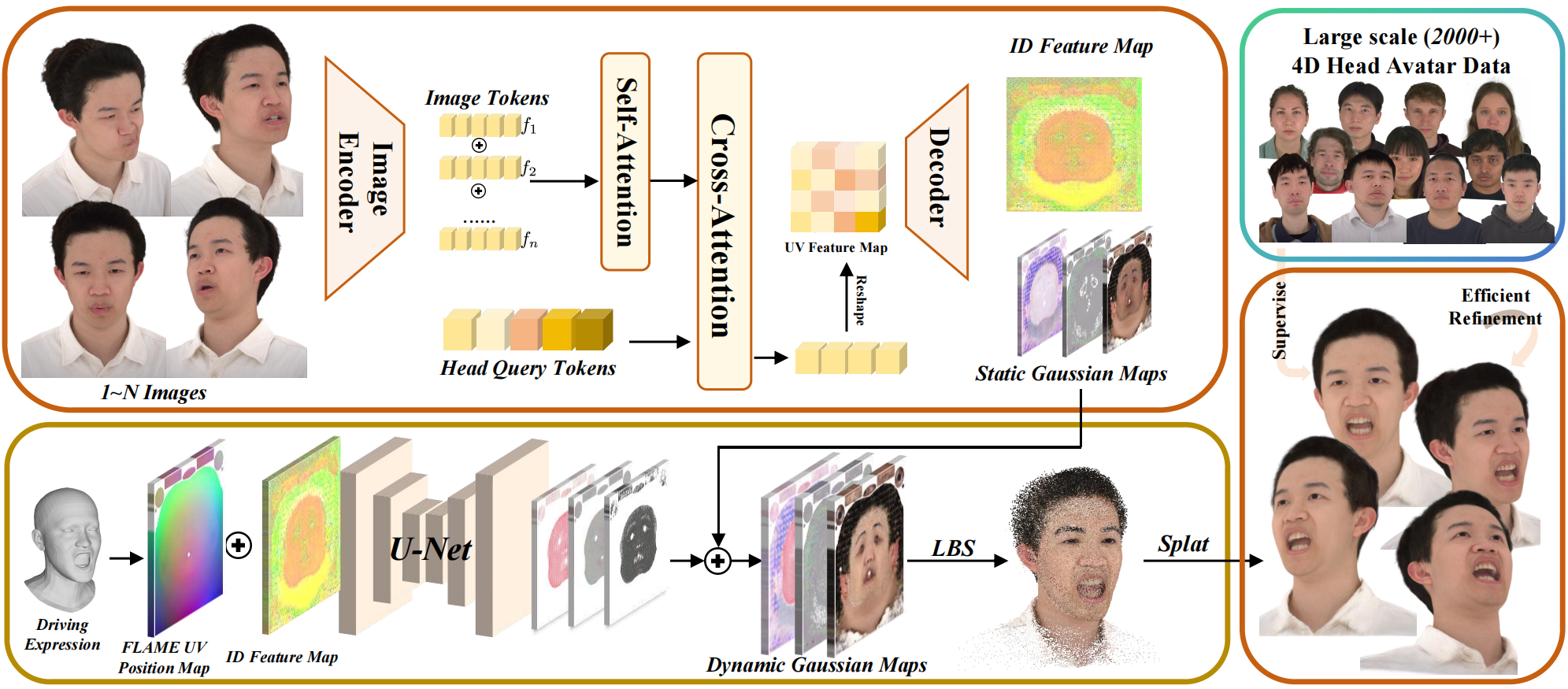 FlexAvatar reconstructs a high-quality Gaussian head avatar by mapping input images with varying expressions and camera views into Gaussian representations in UV space, through the following steps: