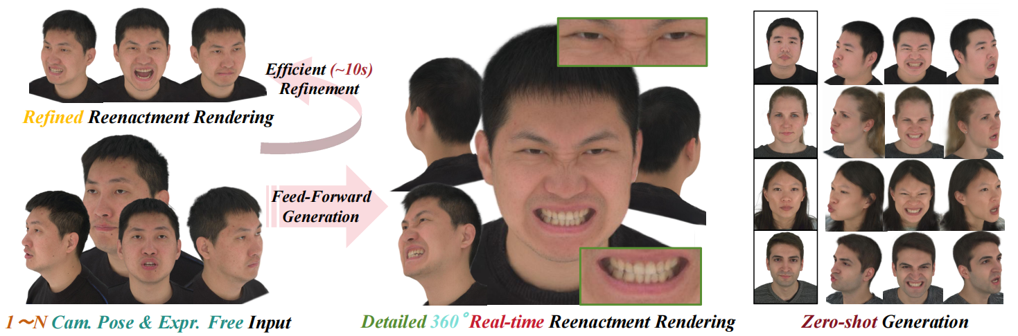 Ultimately, our proposed FlexAvatar produces detailed, real-time 360° reenactment renderings.